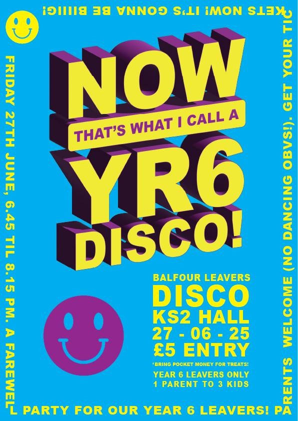 A farewell disco on Friday 27th June from 6:45pm to 8.15pm to celebrate the end of Primary School for our Year 6's and raise funds for the school.